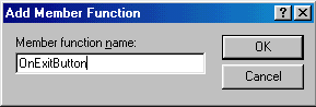 Теперь свяжем кнопку EXIT с событием BN_CLICKED - оно возникает при нажатие на кнопку. Для этого щелкнем в Object IDs на IDC_EXIT_BUTTON, справа появится события, с которыми можно связать эту кнопку. Выбираем там BN_CLICKED. И щелкаем на кнопке Add Function , которая находится справа. Этим нажатием вы говорите Visual C++, что вам необходимо связать это событие с функцией. Выведетя такая диалоговая панель, где вам предложат выбрать название функции. Оставьте все по умолчанию и нажмите кнопку OK.