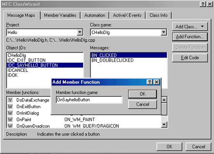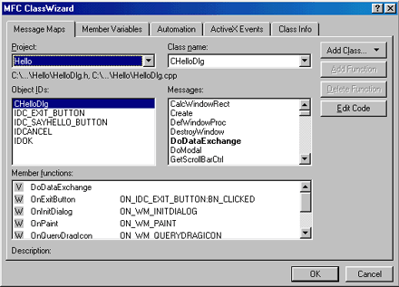 Сейчас мы свяжем элементы управления с событиями. У нас всего два элемента - это две кнопки: Say Hello и Exit.Теперь мы будем пользоваться еще одним мастером ClassWizard, он сильно облегчит нам работу. Зайдите в VIEW->ClassWizard, появится такая диалоговая панель